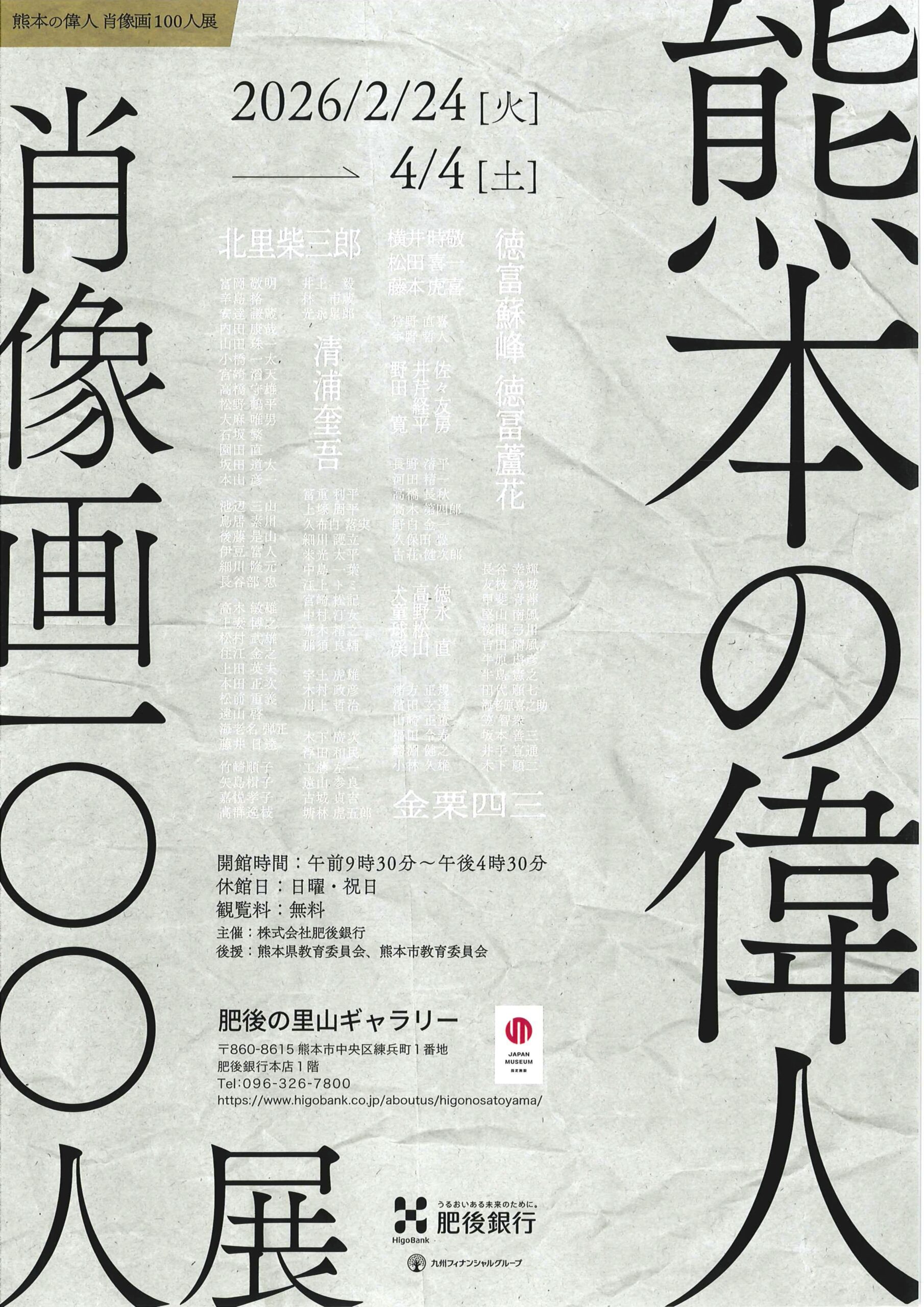 申 込:チラシQRコードの申込みフォームか、肥後の里山ギャラリーへ電話(096-326-7800)、またはギャラリー受付にて申込み。日曜・祝日・閉室中の土曜日の申込みは不可です。