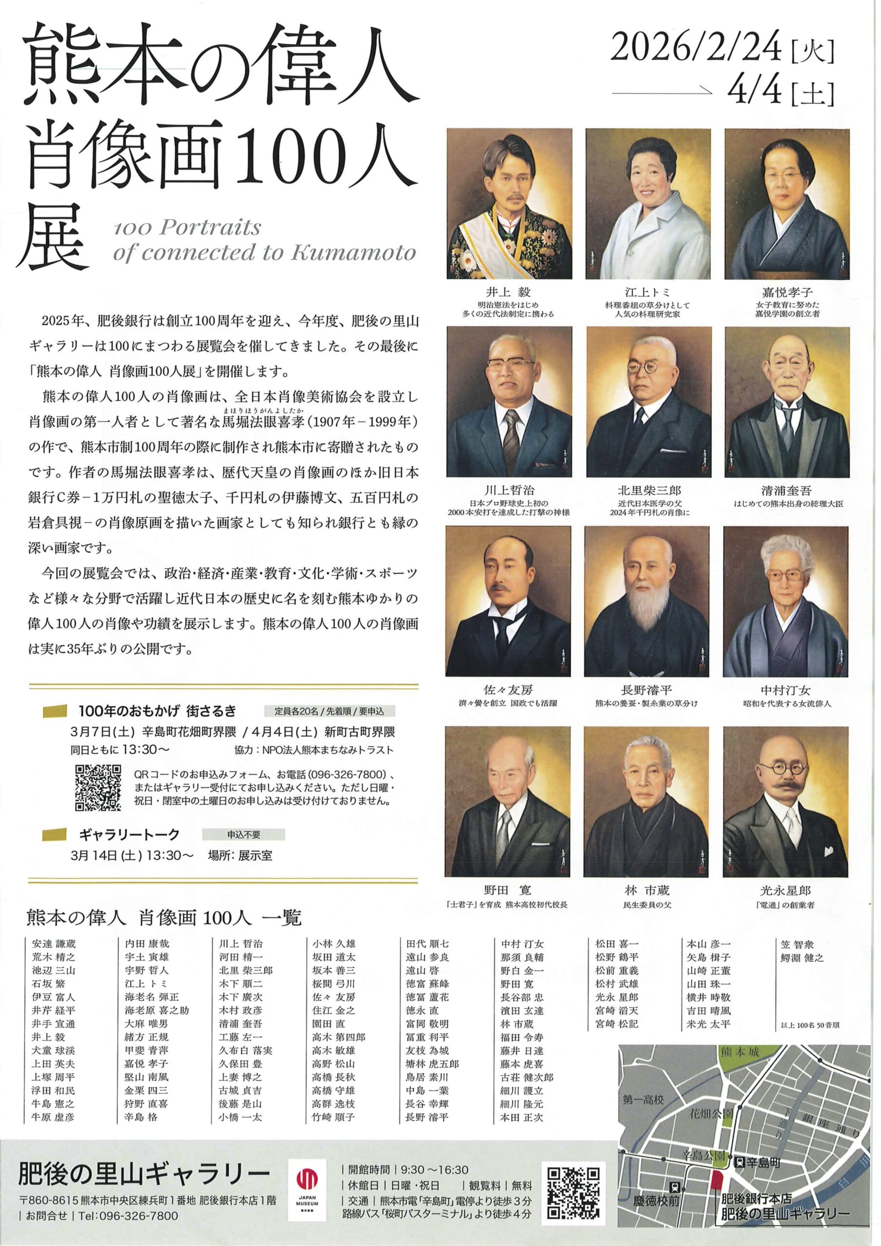 今回は、別添のとおり肥後の里山ギャラリーの企画展第5回企画展「熊本の偉人肖像画100人展」にあわせて、熊本まちなみトラスト例会として協力し、「100年のおもかげ 街さるき」と題してまち歩きを開催することになりました。ご案内は伊藤理事長、冨士川理事、竹田事務局長で予定しており、偉人肖像画100人のうち甲斐青萍、田代順七が遺した絵画の話なども交えながら歩きたいと思います。皆様ぜひご参加ください。